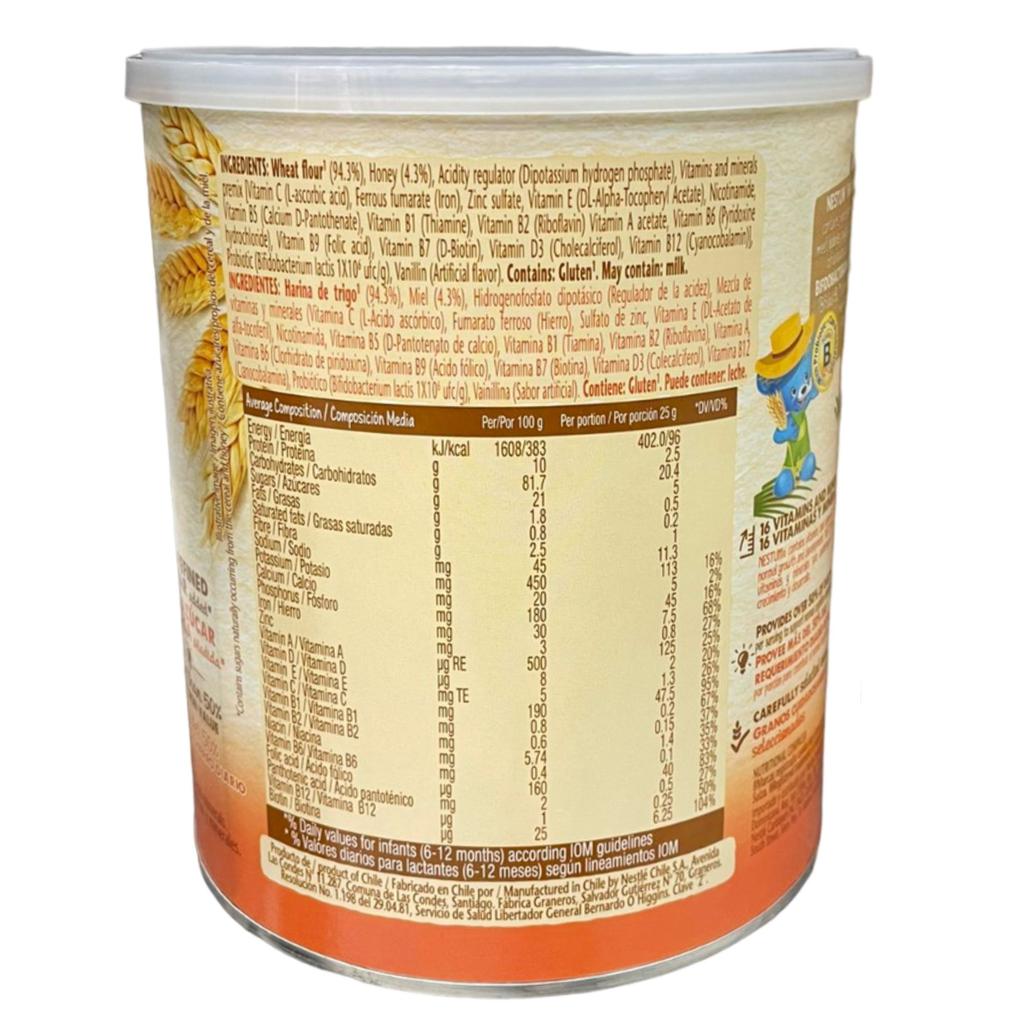 Wheat Flour, Sugar, Honey (4%), Minerals (Calcium Carbonate, Dipotassium Phosphate), Vitamins and Minerals (Vitamin C, Ferrous Fumarate, Zinc Sulfate, Vitamin E, Niacin, Calcium Pantothenate, Vitamin B1, Vitamin B2, Vitamin B1, Vitamin B2, Vitamin A, Vitamin B6, Folic Acid, Biotin, Vitamin D3, and Vitamin B12) Probiotic (Bifidobacterium lactis 1*10¨UFC/g) and Natural Flavor (Vanillin). Contains Gluten and may contain Milk.